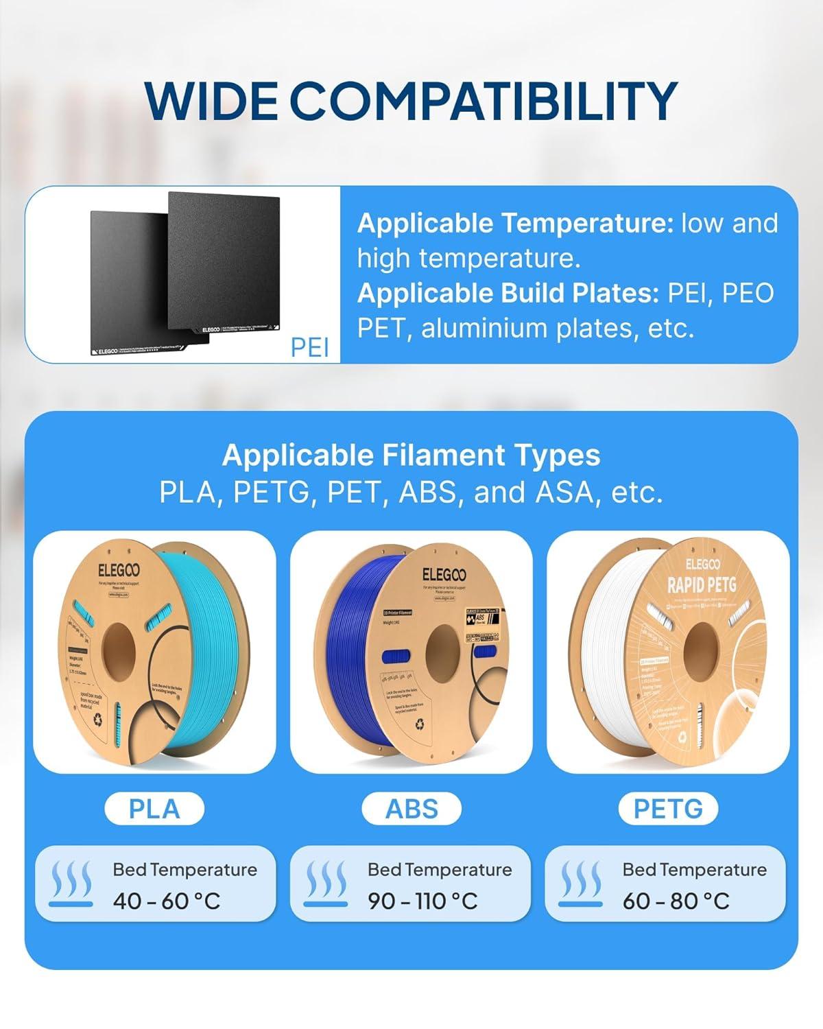 UNIVERSAL COMPATIBILITY: ELEGOO 3D printer adhesive glue works with ABS, PLA, PETG, TPU and other filaments. Compatible with smooth or textured PEI, tempered glass, PEO, PET, and aluminum hotbeds to help prevent warping