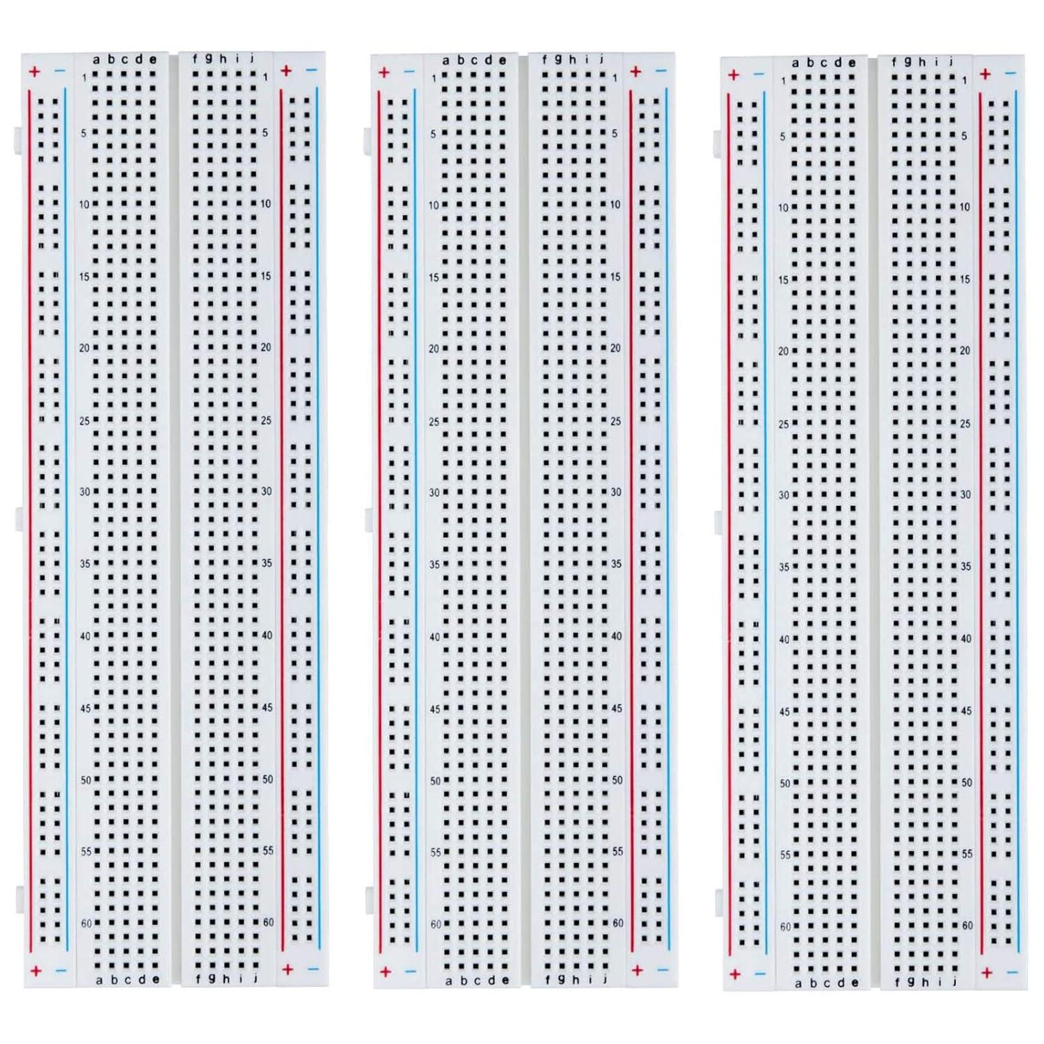 ELEGOO Breadboard of 830 Point consists of 630 tie-point IC-circuit area plus 2×100 tie-point distribution strips providing 4 power rails.