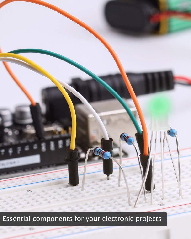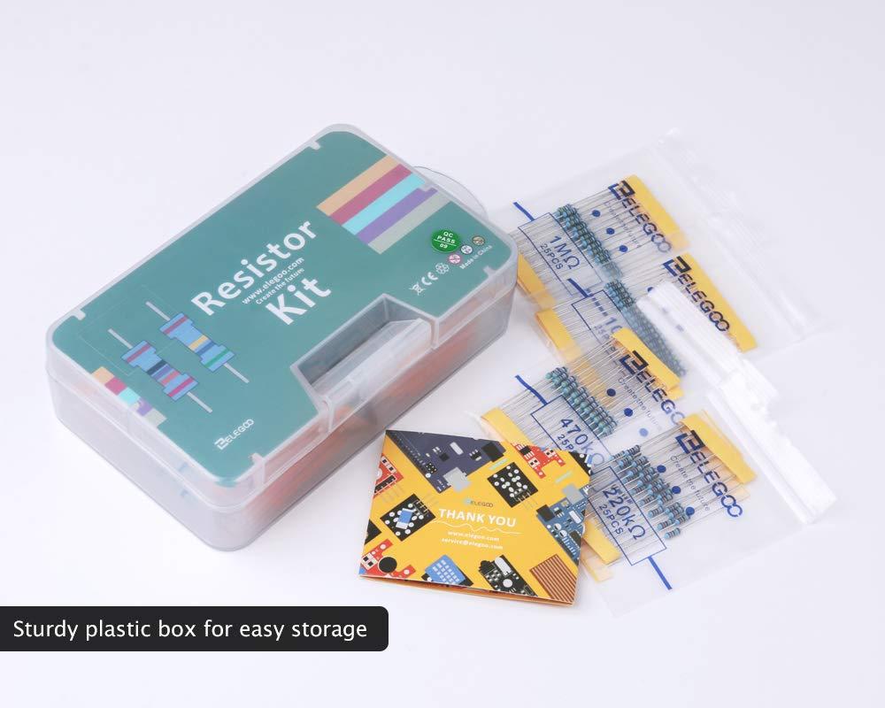 ELEGOO 17 values 1% resistor kit comes with 50 pcs frequently used resistors (100, 220, 1k, 10k Ohm) and 25 pcs seldom used resistors. Color Code Guide helps you read the resistance