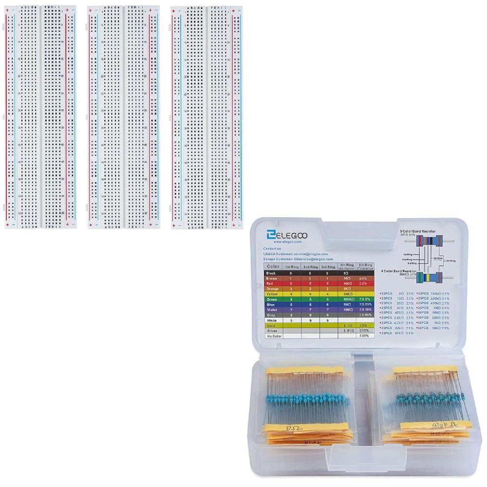 What's In the Bundle? ELEGOO 3pcs Breadboard 830 Point*1, ELEGOO 17 Values 1% Resistor Kit*1