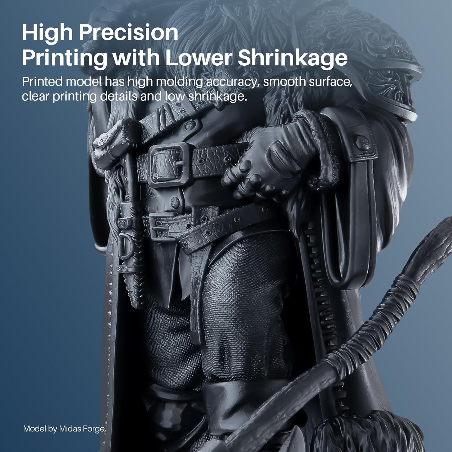 【High Precision, Low Shrinkage】This ELEGOO resin delivers exceptional dimensional accuracy with smooth surfaces and crisp details. The low shrinkage rate minimizes the risk of warping, allowing you to produce clear, highly detailed models.