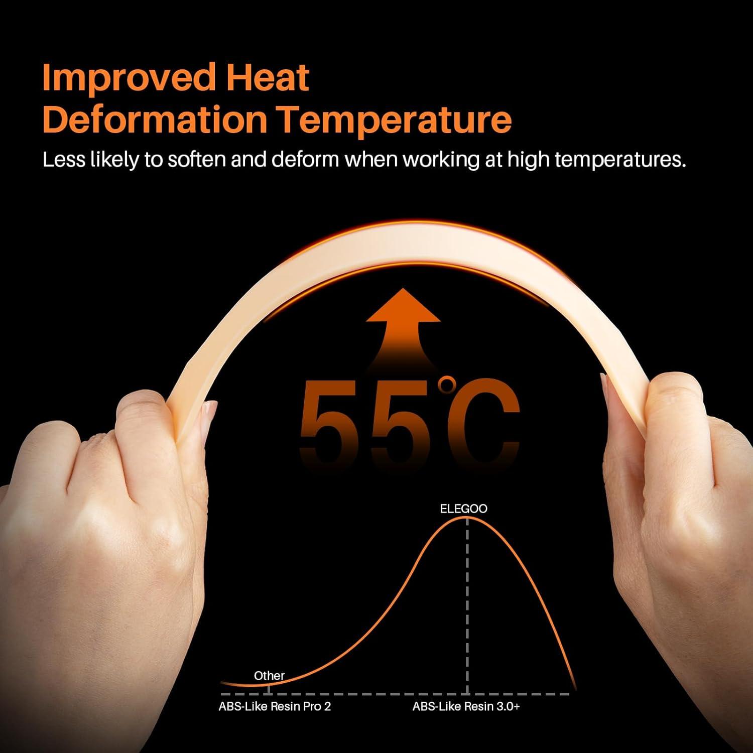 【Enhanced Heat Resistance】ELEGOO ABS-Like 3.0+ resin boasts an approximate 10% increase in heat deflection temperature, offering superior heat resistance. This means your models are less likely to soften or deform under high temperatures, ensuring better durability and preservation.