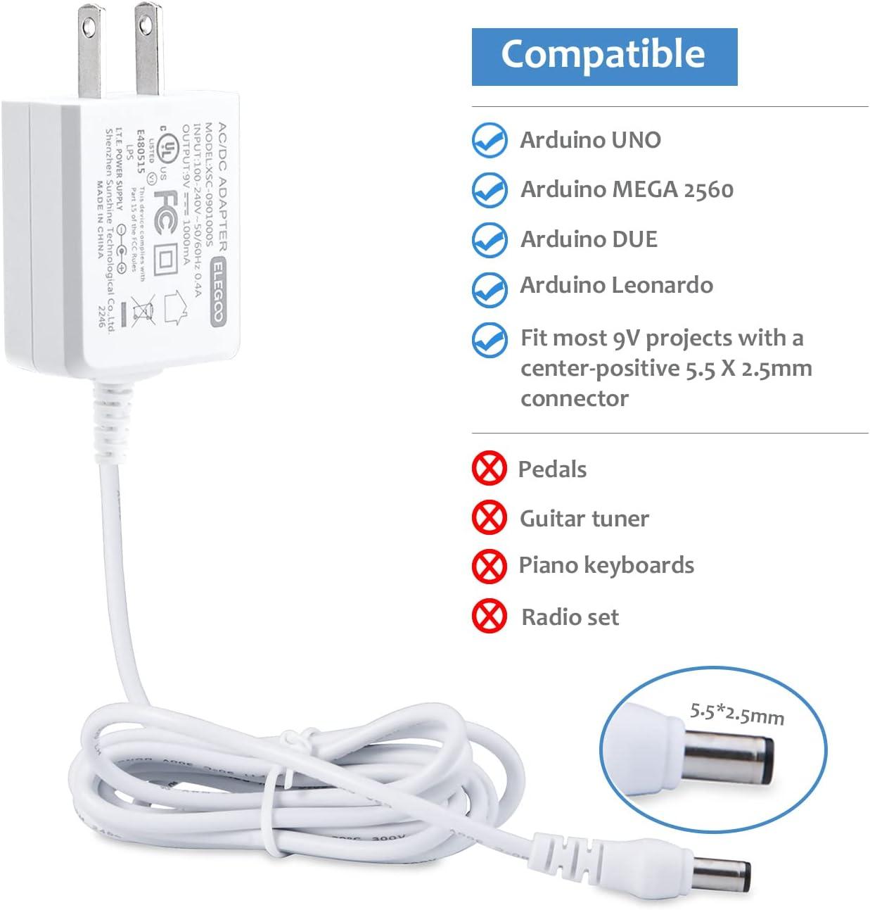 Compatibility with: Arduino UNO R3 Mega 2560 1280, Arduino CCTV. Works with devices require 9V and 1000mA of DC power and physically fits the plug. Please make sure the connector size 5.5×2.1mm can fit your applications before purchase.