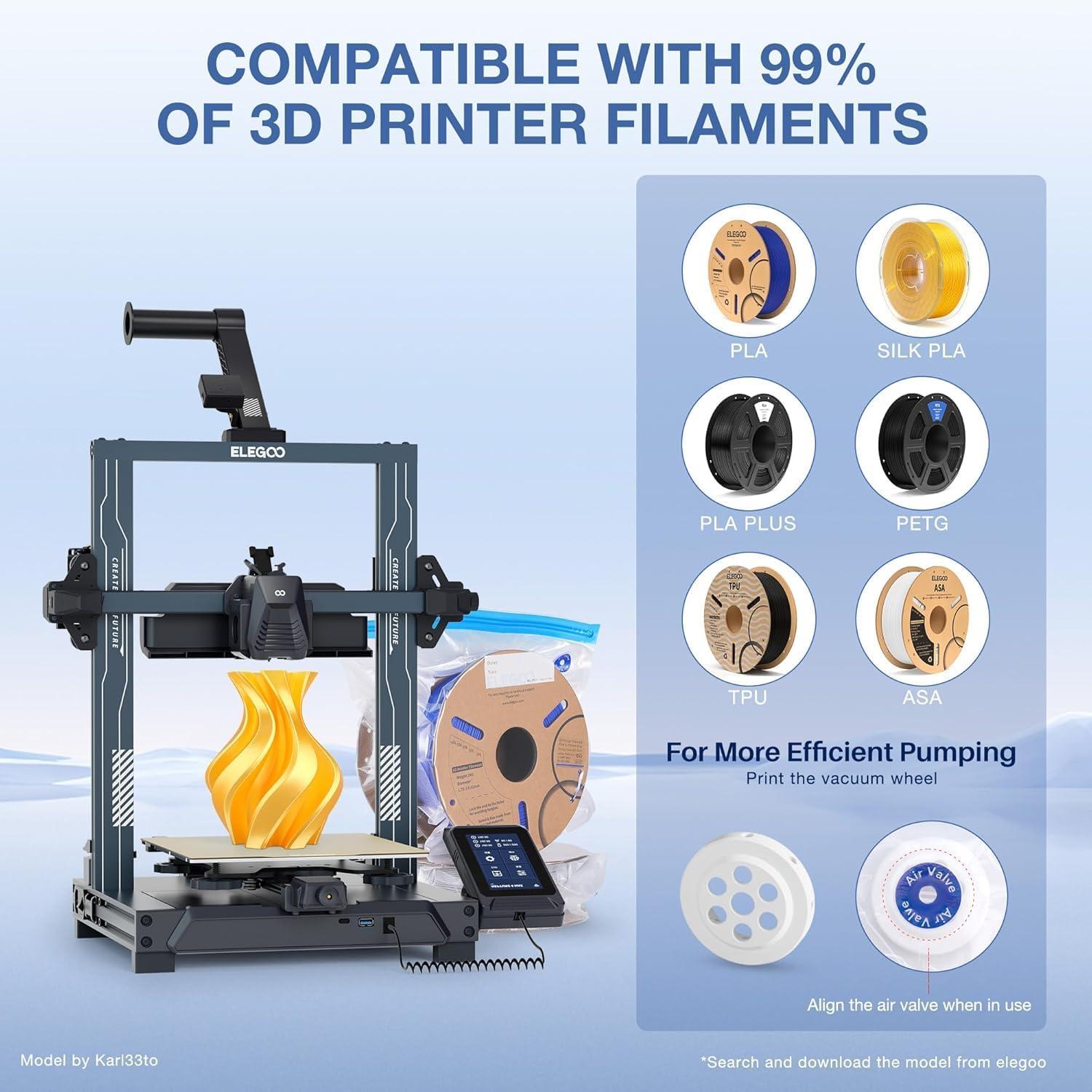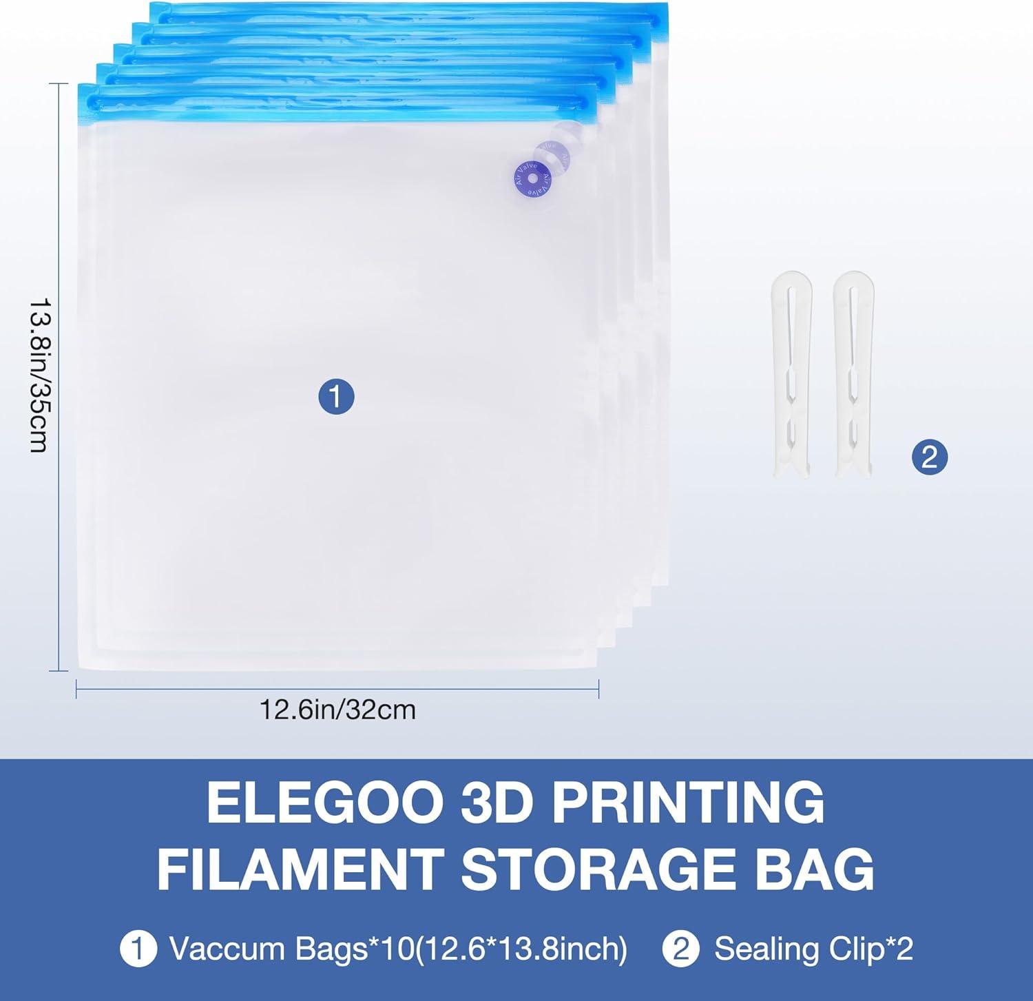 FILAMENT STORAGE BAGS: ELEGOO 3d printing filament storage kit includes 10 vacuum sealing storage bags (13.4”x 11.8”) and 2 sealed clips. NO humidity indicator cards, discoloration and pump included