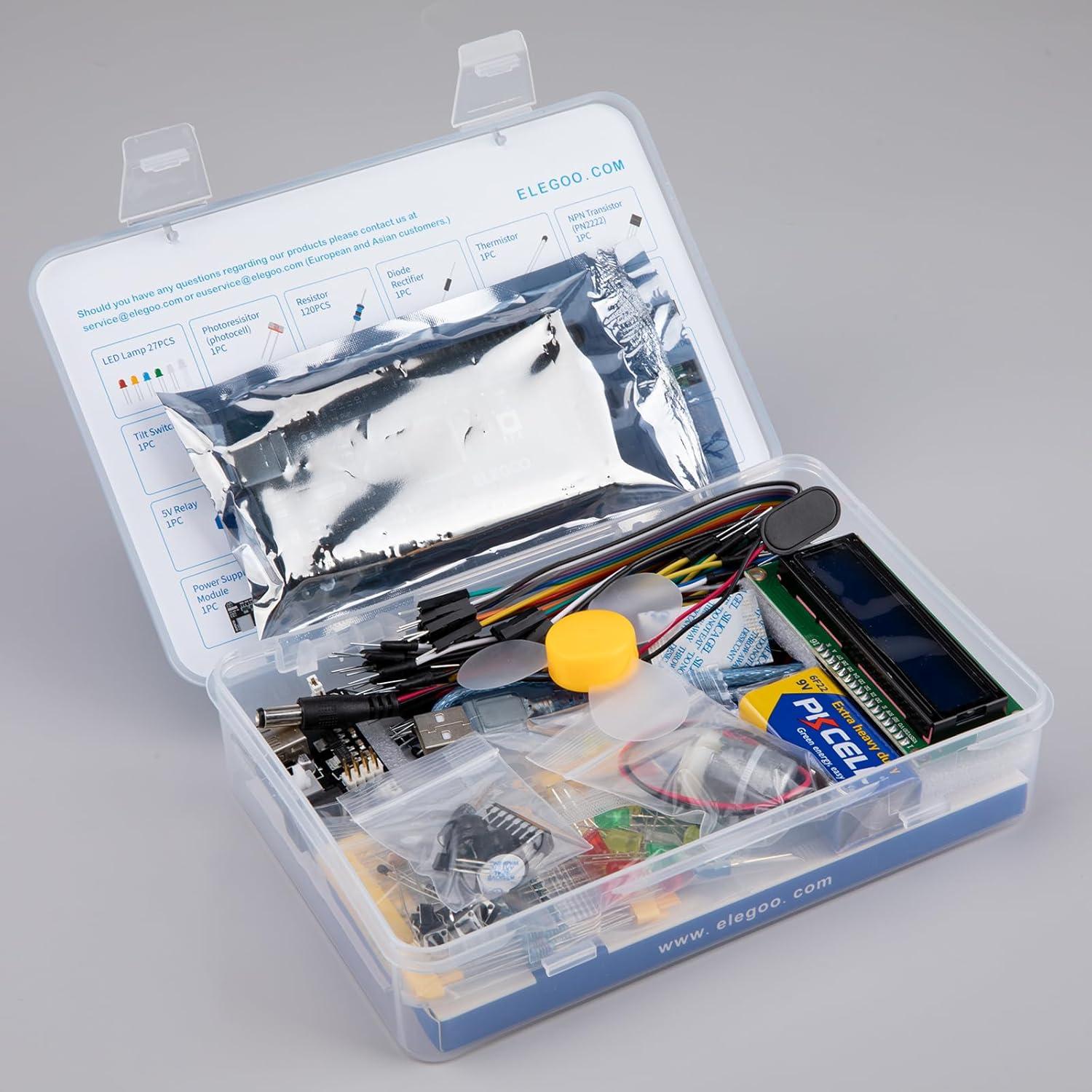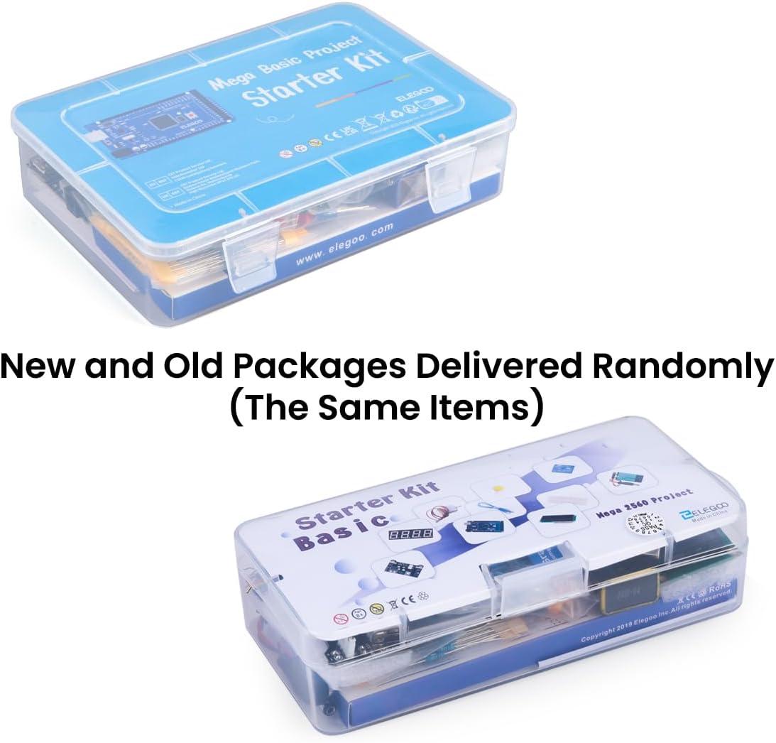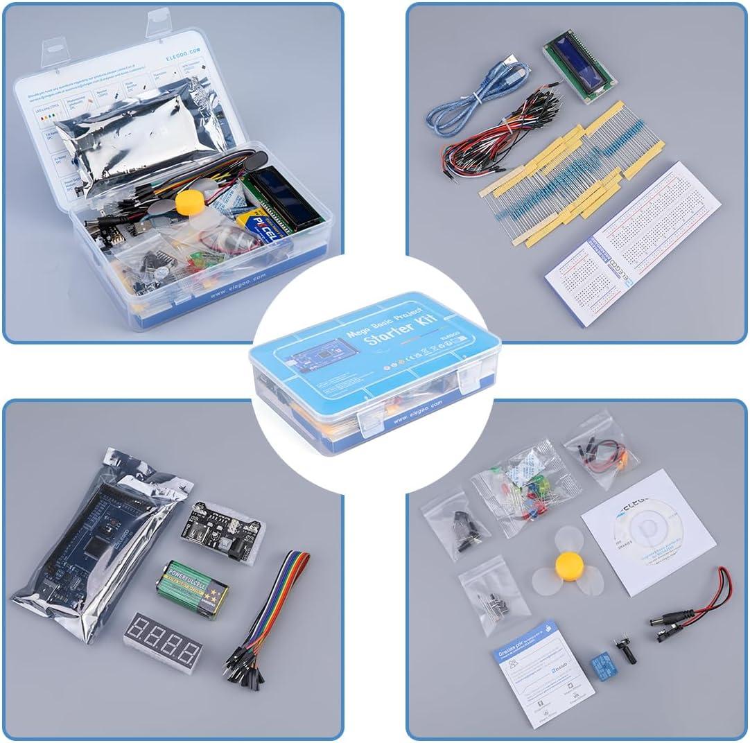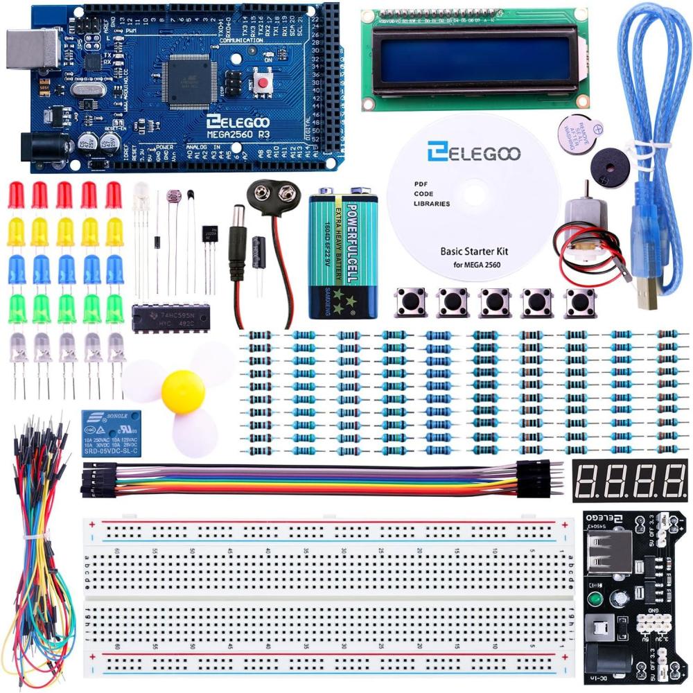 With the newest MEGA R3 development board + USB Cable and all the basic components.
