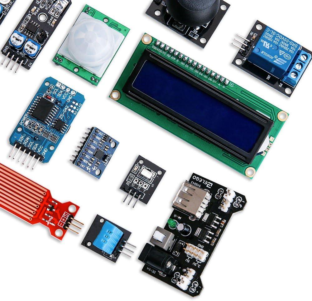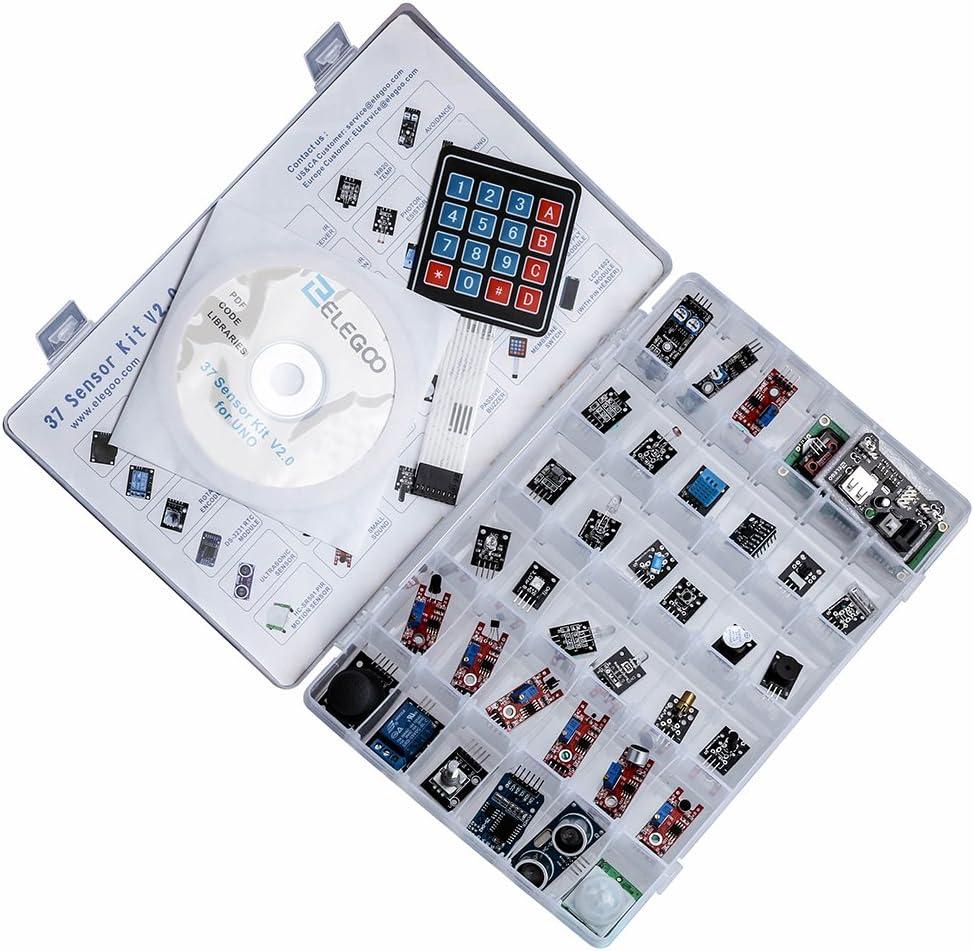 ELEGOO Upgraded 37 sensor modules kit is the most useful and highest cost performance sensor kit in market. It is 100% suitable for beginners. And it is also 100% compatible with STM32. But if you want to use it with STM32, you may find the tutorial by yourself. We only offer the tutorial in our CD. The kit has only sensor modules, if you want to use it, you will need the wires and controller boards. Warning Tip: The input voltage of Elegoo Power Supply Module is 6. 5v – 9v (DC) via 5. 5mm x 2. 1mm plug . Please DO NOT over charge it otherwise it will burn your board and chips. Component listing: 1 x Joystick Module 1 x Relay Module 1 x Rotary Encoder Module 1 x DS-1307 RTC Module 1 x Ultrasonic Sensor Module 1 x HC-SR501 PIR sensor Module 1 x Flame Sensor Module 1 x Linear Hall Module 1 x Metal Touch Module 1 x Digital Temperature Module 1 x Big Sound Module 1 x Small Sound Module 1 x RGB LED Module 1 x SMD RGB Module 1 x Two-tone Color Module 1 x 7 Color Flash Module 1 x Laser Emit Module 1 x Shake Module 1 x IR Receiver Module 1 x IR Emission Module 1 x Tilt Switch Module 1 x Button Module 1 x Active Buzzer Module 1 x Passive Buzzer Module 1 x 18B20 temp Module 1 x Photo-resistor Module 1 x Temperature and Humidity Module 1 x GY-521 Module 1 x Photo-interrupter Module 1 x Tap Module 1 x Membrane Switch Module 1 x Avoidance Module 1 x Tracking Module 1 x Magnetic Spring Module 1 x Water Lever Sensor 1 x Power Supply Module 1 x LCD1602 Module (with pin header)